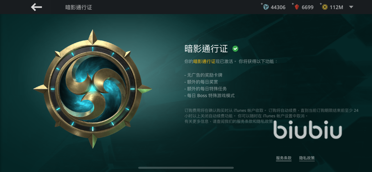 该游戏的亚服设定其实就让很多深度玩家必须氪金的,毕竟打一把就会出现没有办法关闭的广告就只能强退游戏;暗影通行证可以说是老玩家一致认为必氪的道具,除了每天的特殊boss挑战之外,每次翻卡能够有额外的宝石和其他奖赏;对新手来说无疑是快速成长的必备道具。