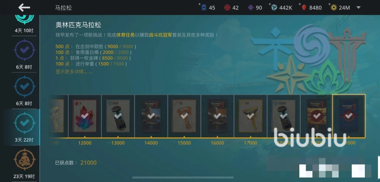 奥林匹克马拉松的过关条件为击剑取胜、吃蛋白棒、获得金牌进行举重;其中他们每完成一项所获得的分数分别为500,100,1,100。而在游戏内哪里有这些项目,很多小伙伴就摸不着头脑了,其实击剑活动就是前往竞技场和其他玩家PK,一场也就是打两局可以获得500点;吃蛋白棒就是开道具增强包;金牌就是用金币在商店里购买道具;举重就是开各种等级的宝箱。