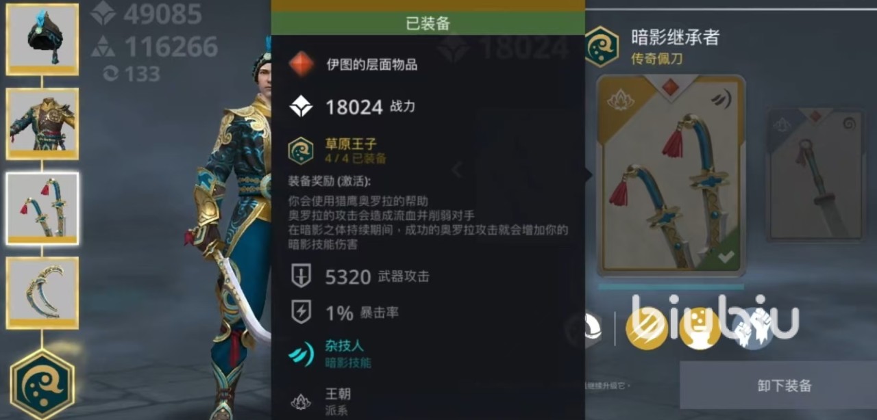草原王子是一套由传奇装备组成的套装,它的套装效果是获得猎鹰奥罗拉的帮助,奥罗拉的攻击会造成流血并削弱对手,在暗影之体持续期间,奥罗拉的成功攻击可以增加我方暗影技能伤害。这是一套属于王朝派系的装备,头盔选择的是鹰峰,非常有印度王子的风格,带有的暗影技能是爆裂。衣服选择的是影纶传奇盔甲,也同样非常华丽,上面有大量装饰品,带有陀螺传暗影技能。