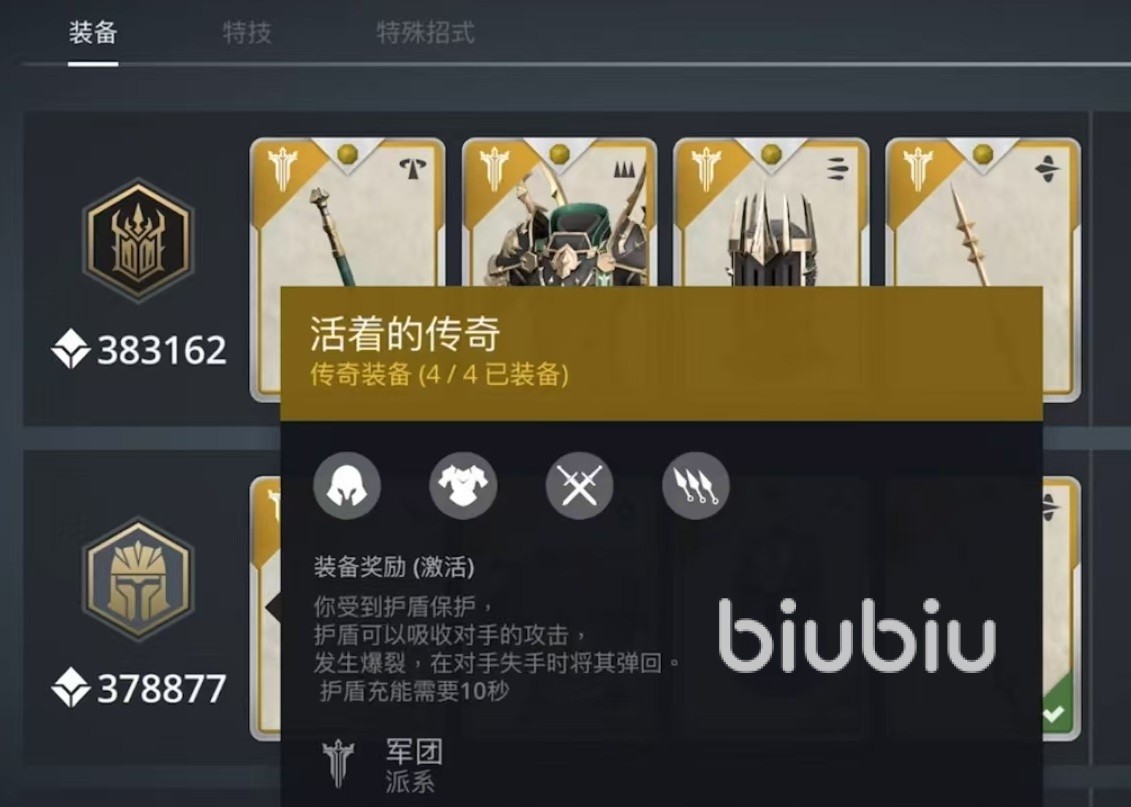 这一套装备的效果是受到护盾保护,护盾可以吸收对手攻击发生爆裂,在对手失手时将其弹回,护盾充能需要10秒钟。这是一套属于军团派系的装备,它自身的外形也符合军团的特点。