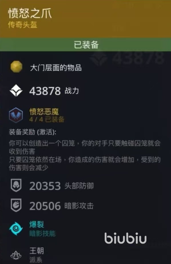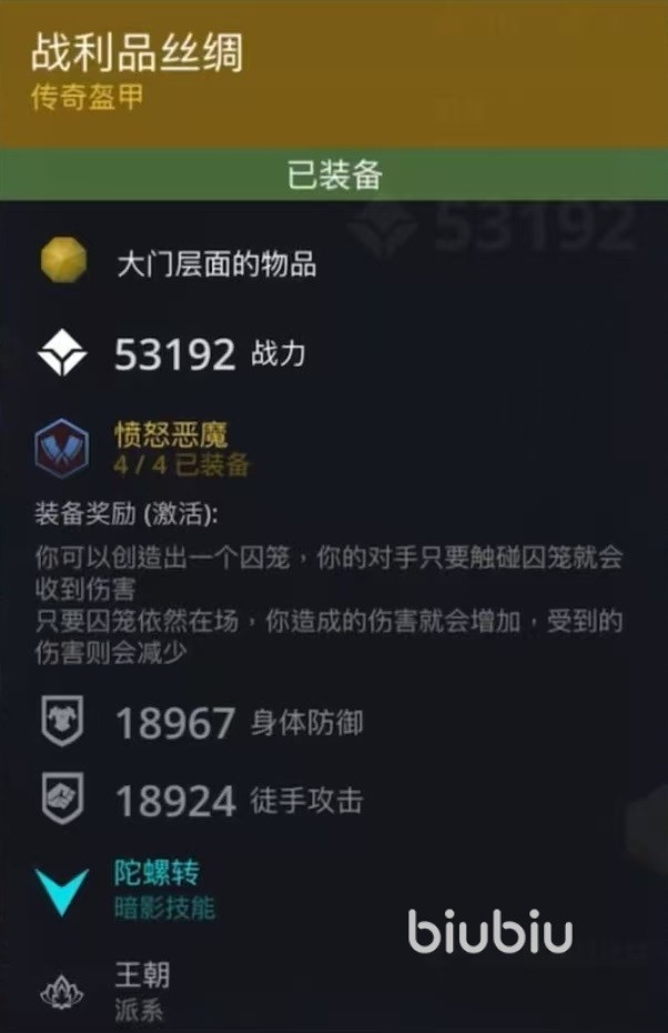 当大家在集齐了4件装备之后,就会获得装备奖励效果。能够在战斗中创造出一个囚笼,对手只要触碰到囚笼就会受到伤害,只要囚笼依然在场上,那么玩家造成的伤害就会增加,受到伤害则会减少。也就是创造出囚笼之后,可以有效地限制对方移动,同时利用带来的加成获得场上的优势。这套装备的头盔是愤怒之爪,它所带有的暗影技能是爆裂,盔甲是战利品丝绸,带有的暗影技能是陀螺传。
