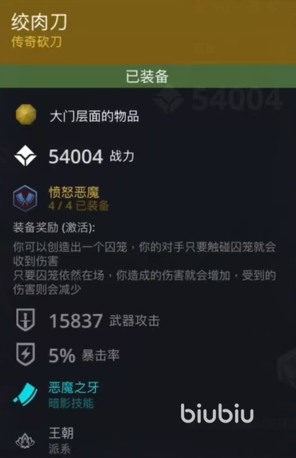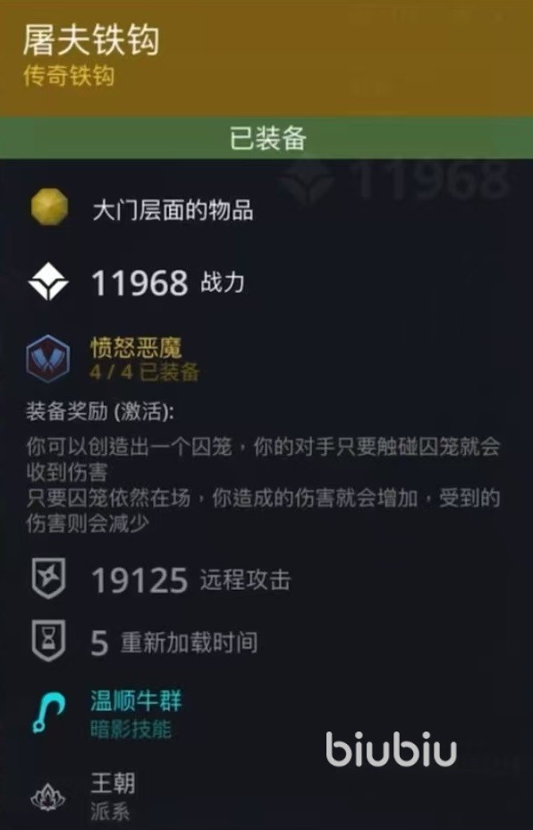 使用的武器是传奇砍刀绞肉刀,能够增加暴击率和武器攻击,带有恶魔之牙暗影技能。另一件武器是传奇铁钩屠夫铁钩,带有的暗影技能是温顺牛群。在战斗过程中,界面左侧方向键上方会出现独特按键图标,按键图标冷却时间刷新之后,点击就可以直接触发牢笼。在牢笼存在期间,伤害增加,受伤减免,敌人触碰到之后就会受到伤害,所以对方会非常难受。