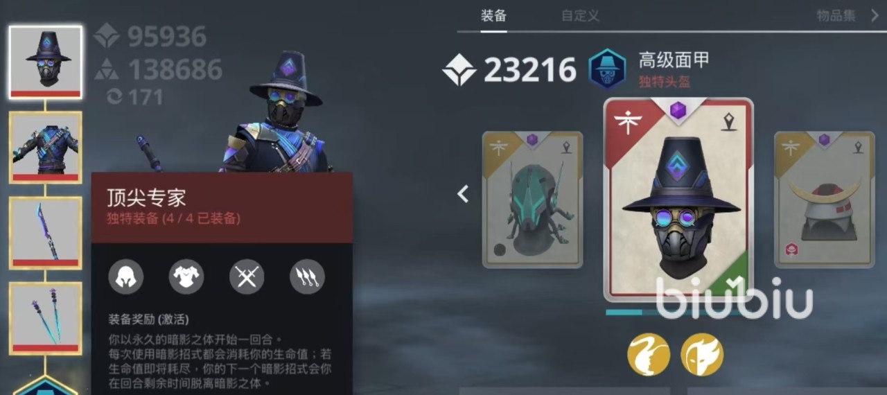 顶尖专家是一套独特品质的套装,它所包括的装备有4件,第1件荣誉飞针,附带的暗影技能万针齐发,它能增加远程攻击力和重新加载时间。主武器是惩戒薙刀,增加武器攻击力和暴击伤害属性,带有飞踏暗影技能。护甲方面是实用模型,能增加身体防御和徒手攻击属性,带有摧毁暗影技能。头盔选择高级面甲,增加头部防御和暗影攻击,附带迸火暗影技能。