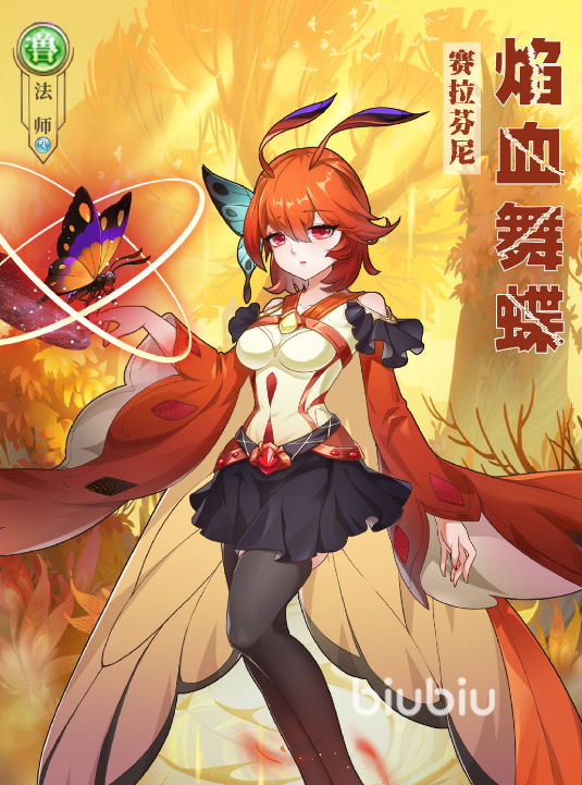 焰血舞蝶·赛拉芬尼,这名英雄时一名火属性的法师,技能效果比较全面,从伤害到回复到护盾她都有,是一位万金油的后排角色,她的技能还有减少治疗效果的属性,可以烧掉地方的能量,在pvp中非常的好用,另外被动可以为队友提供护盾,在濒死的状态下可以提供一个百分之100生命值的护盾并且原地复活,生存能力是相当的恐怖。