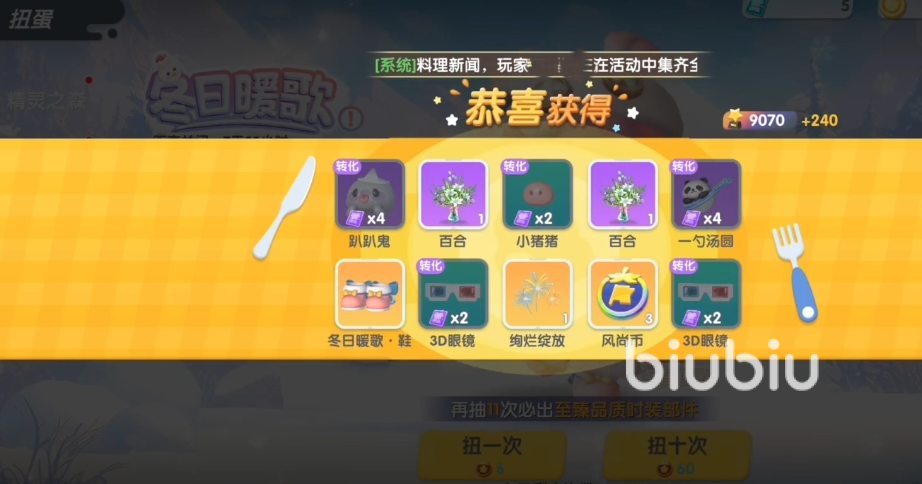 因为游戏的玩法很简单,整体的玩法调性主要也以轻松愉快为主,因此在扭蛋机的玩法上也很简单,只要有足够的蕃茄币就能不断的抽取时装内容,每次抽取耗费100个蕃茄币或者是扭蛋券。如果游戏有推出限时活动的话,玩家们参与限时活动也是有机会能免费抽取相关的时装内容。