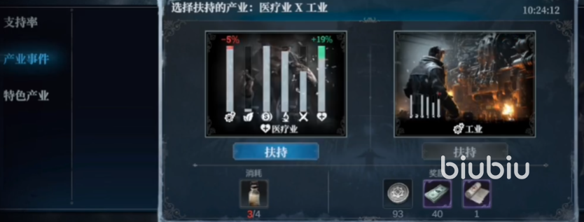 产业事件每一次刷新后,都会让我们选择扶持的目标,以下图为例,会问我们要扶持工业还是医疗业,不管支持哪一边,我们都需要消耗资源油,与之相对也会给我们相应的奖励。