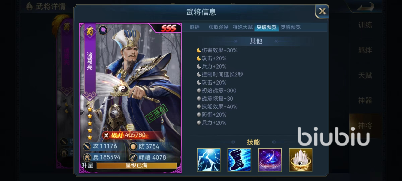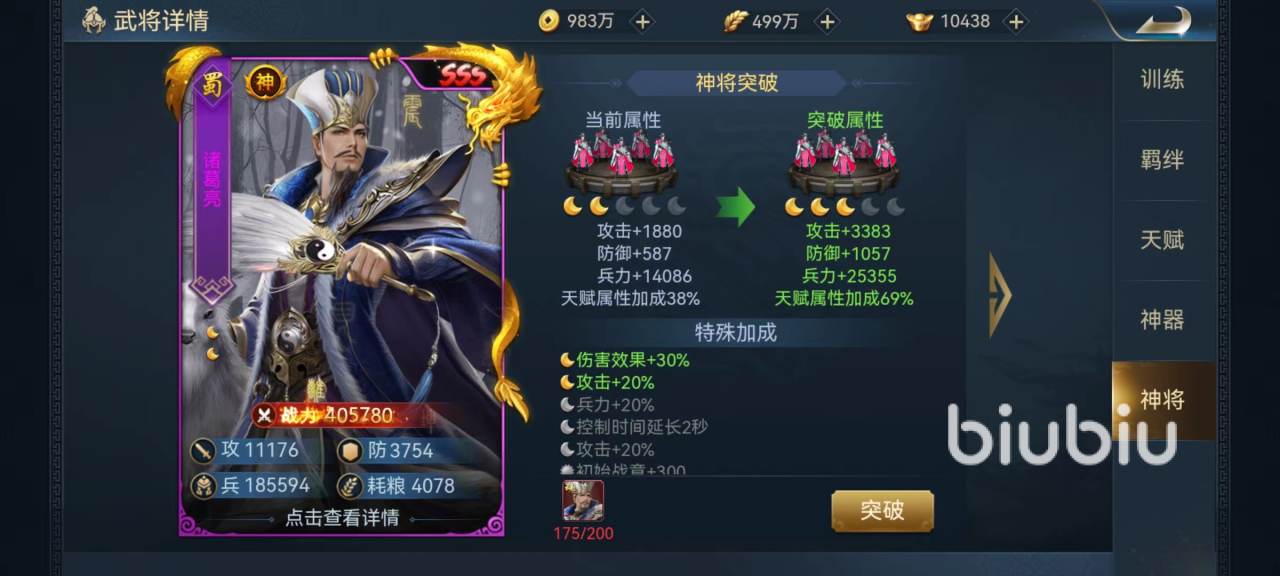 每一次神将突破后都会提升非常明显的效果,以诸葛亮为例,第1次突破提高伤害加成效果,第2次按比例提高攻击力,第3次提升兵力,后续还有提升控制时间,提高战意恢复和初始战意值以及提高技能效果的状态。不同的武将突破后提升的状态也不一样,主要根据技能效果来提升,所以突破后增加的是否是最关键的属性,也是挑选武将时一定要看清楚的地方。