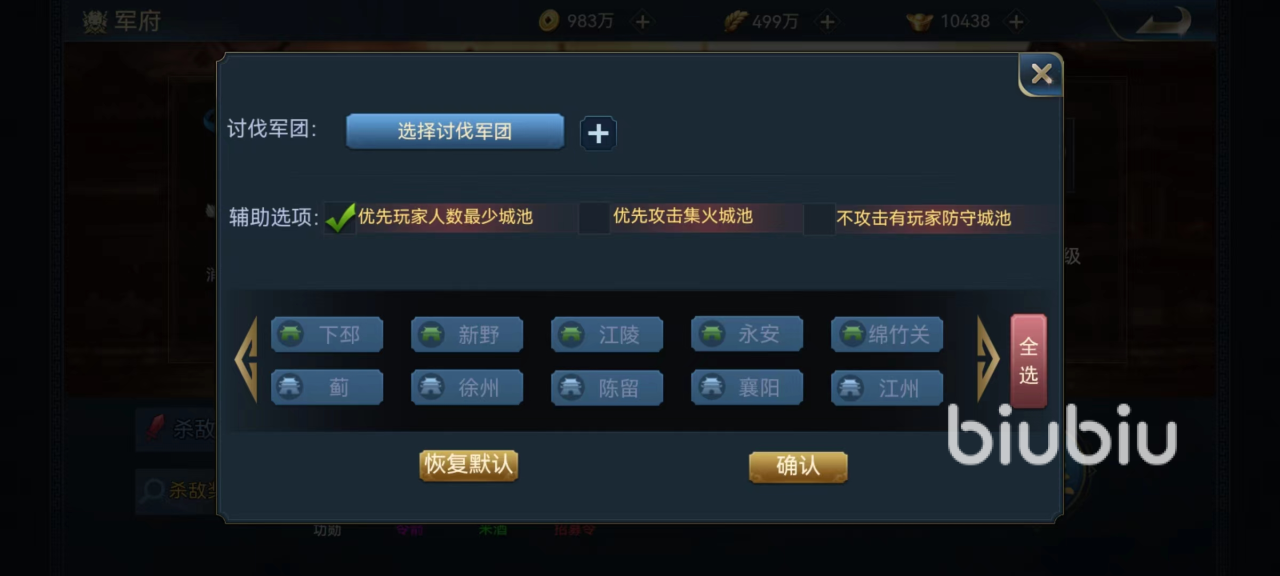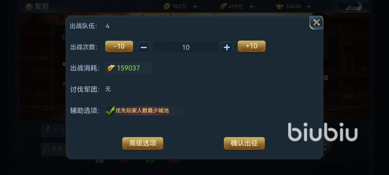 在这里还可以设置一个辅助选项,可以在三个攻击偏好中进行选择,这里小编推荐大家优先选择不攻击有玩家防守的城池,这样可以提高效率。也可以选择加入到一个讨伐军团中,也能增加获得的奖励。在高级选项中还可以看到有当前可攻打的城池,建议直接全部选择,这些设定完成后点击出征就可以自动去战斗了。最后在准备粮草方面,可以在府库中征收,也可以在封地中通过种田来获得。