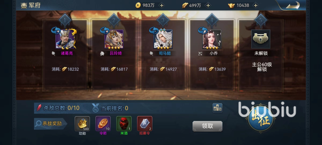 在这里出战的队伍主要是去自动战斗,也就是参与到大地图中的攻城战,但是无需玩家自己操作,只要设置好队伍之后点击出征,然后选择出战的次数,就可以自动开始战斗。这里需要准备的是粮食,因为每次出征都要消耗大量粮草,同时出战的队伍越多消耗的也就越多,后面小编将简单介绍一下粮草的获取。通过自动战斗可以获得杀敌奖励,主要包括功勋、令箭、米酒、招募令等,功勋可以在军团商城中购买到大量道具,令箭用于军团夺宝,招募令可以招募到更多武将,米酒在酒馆中使用。