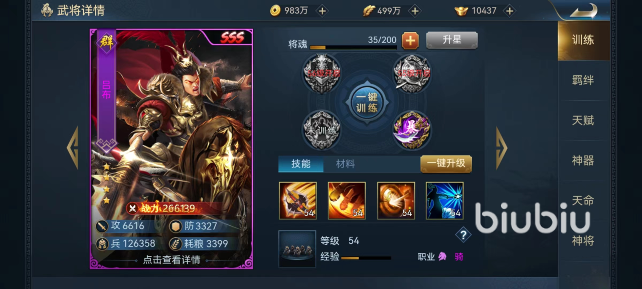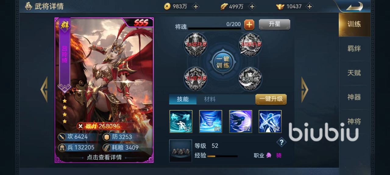 接下来是吕布和吕玲绮这对输出父子兵,吕布属于第一流输出武将,强度自然不用多说,全屏伤害大招能够对敌方带来巨额输出,同时降低攻防属性,在进入战斗后自身移动速度增加进行全场输出,还有附加武力值提升效果。吕玲绮也同样不甘示弱,能够使用一骑当千对每一个敌人依次发起冲锋,过程中还将处于无敌状态,每隔15秒钟就能自动释放一次双戟风暴,伤害周围敌人并且附加流血伤害。在自身兵力低时大幅提高攻击速度和攻击力,免疫一切控制效果。当吕玲绮普通攻击命中目标处于流血状态时还将获得兵力回复,同样放到前排和马云禄一起去扛伤害。