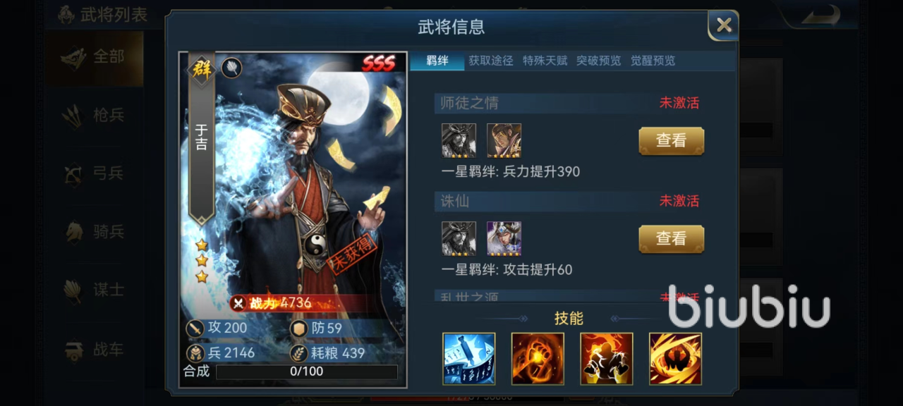 于吉这名武将是小编非常喜欢的一个,技能开启后伤害全场敌人,并且有几率使其在防御清零和命中清零中2选1。无论是命中还是防御都是极为重要的属性,没有命中值对方就无法普攻输出,而失去了防御我方的吕布和吕玲绮则是能砍瓜切菜般的将对方消灭掉。无论触发哪一种状态对战斗影响都是非常重要的。而且于吉在阵亡之后还有几率复活,一般武将要想获得复活状态需要突破到后期才能得到,而于吉在初期就自带这是一项很重要的优势。