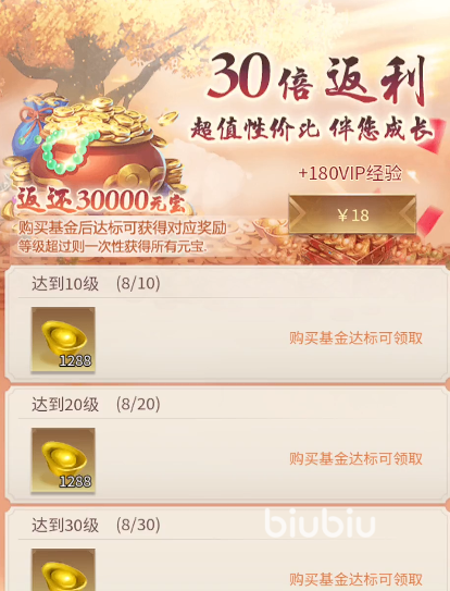 在充完了特惠礼包之后,下面大家还可以去氪游戏中的基金,在大家充完基金后就能获取基金返利,这个返利的值是要比充值的花费高很多的,这也就是说,充基金就相当于一分钱没充,之后充的钱会连本带利的返还给玩家。