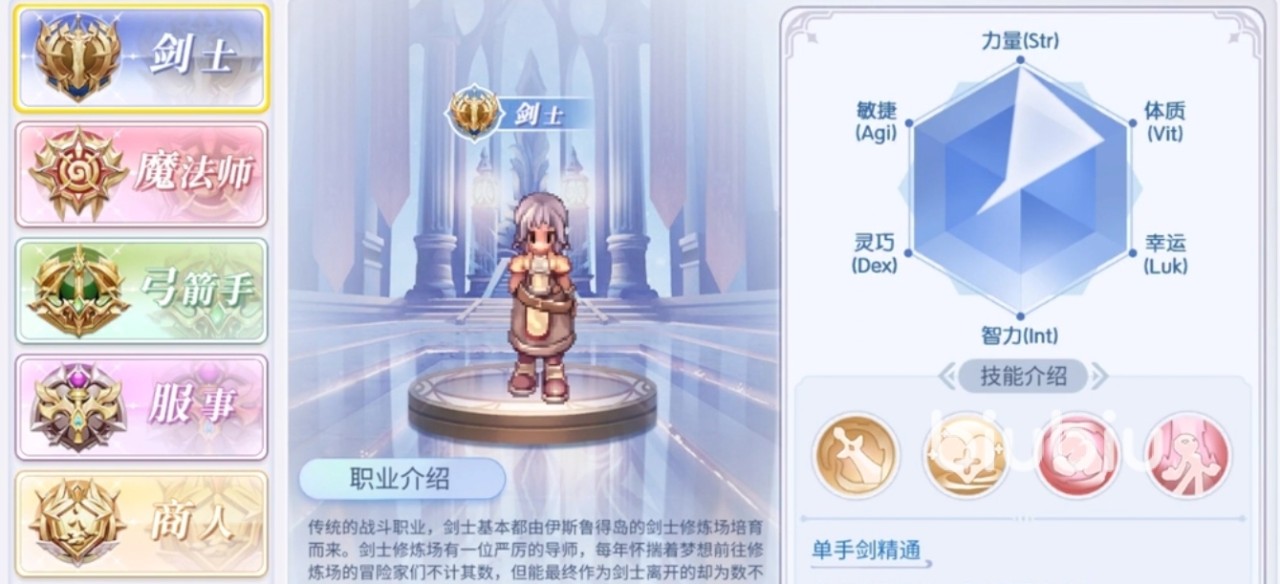剑士前期转职有两个方向,分别是猛击以及敏击。前者是注重单体爆发输出的近战,后者就是发展敏捷与攻击力的均衡战士。前期两者选择差别不大,小编比较推荐选择敏击,虽然刷怪效率没有猛击那么高,但是属性发展比较均衡,后期能抗能打。二转之后,剑士可以选择成为长矛骑士或者大剑骑士:
