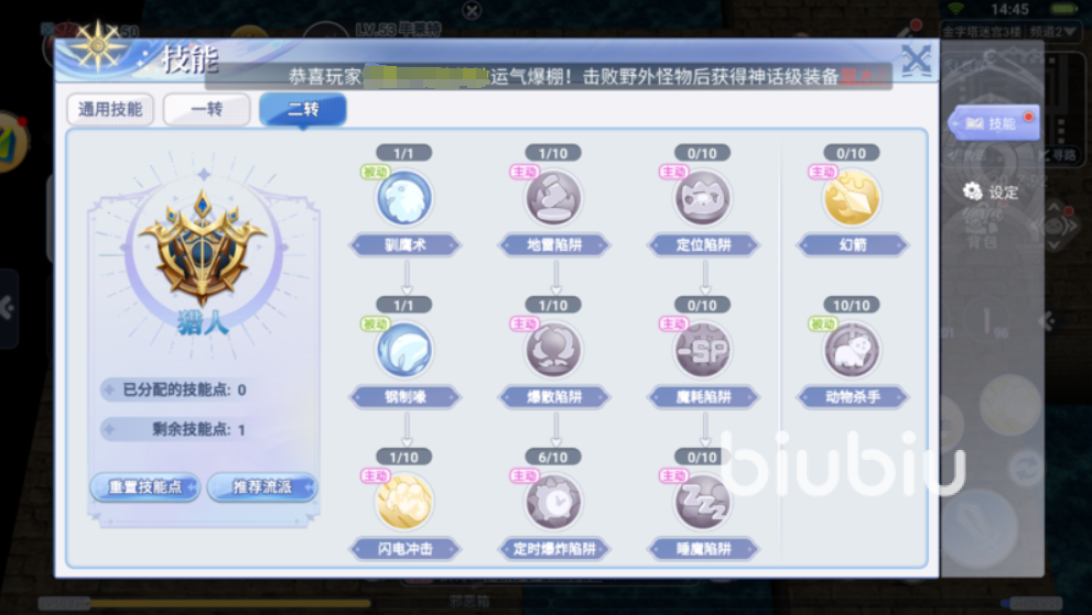 如果你的等级已经攀升至很高的级别了,就可以开始进行二转,二转后便可学习训鹰术、闪电冲击以及钢制喙,这些技能加一级即可,可以起到一个功能性的作用。接着猎鹰冲击的话,则需要直接升到最顶级,可以加暴击。