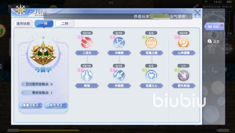 当你经过严格的训练之后,不断升级便可成功开启首次转职,这时候即可成为弓箭手。建议将箭雨、二连矢、苍鹰之心等技能给直接点满,因为这些都是主要技能,可以加伤害,另外还能快速射击对手。