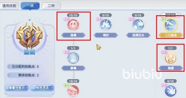 二转的话先学一下“涂毒”、“武器双持”、“右手-修炼”、“左手-修炼”、“毒散播” 。学习了武器的双持后就可以同时装备2把主武器,伤害也更高,并且可以插上更多的卡槽。如果想玩全刃刺客也行,玩法套路并不固定。