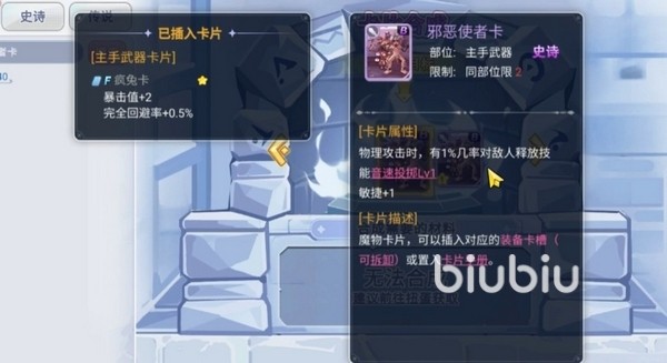卡牌推荐“黑蛇卡”,这是主手武器的史诗卡片,卡片属性可以让人物的普攻有一定几率(6%)触发二刀连击,搭配自身的被动,对双刀刺客来说是很有用的。另一张卡片推荐“邪恶的使者卡”,在造成物理伤害的时候,有一定几率对敌人释放“投掷”,同时还可以提升人物的敏捷属性。这个效果不会像人物技能那样有限制,卡片的这个技能只要造成物理伤害都有几率触发。此外还可以用“恶鸟男爵卡”,在物理攻击时有几率对敌方释放天使之怒,“恶鸟首领卡”是有几率对自己“神威祈福”提升自己的攻击力。