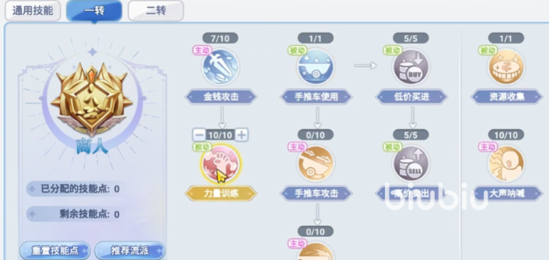 然后“资源收集”1级,“低价买进”和“高架卖出”5级,“手推车”1级,“金钱击”7级,一转总共可以得到39个属性技能点,按照这样的方式分配刚好用完。先将其它技能点好,剩余多的技能点就用在“金钱攻击”上,这也是一个瞬发的短CD伤害技,造成170+160%力量属性以及110%物攻的伤害,可以补一点伤害,不过大多时候并不用这个技能,主要还是高普攻打伤害。