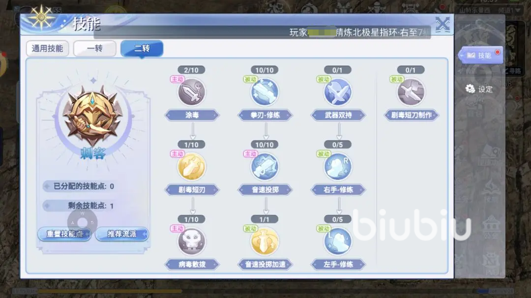 在对这个职业技能进行选择的时候,一般都是基于他敏捷的属性的,攻速还有用毒的属性也是重点考虑的因素,所以这几个技能一般都是会被拉满的,其他的话可以酌情根据实际情况来考虑了,比如残影之类的,可以提高角色的闪避值。