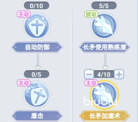 第二个技能是长矛使用熟练度。这个技能是可以增加长矛的攻击力,攻速,暴击。技能因为本身是被动的原因,这对于玩家们练级也是有着相当的好处,所以建议这个技能还是要点满。长矛加速术,这个技能是使用后在300秒之内让角色的攻速,暴击,闪避都得到一定程度的加强。这个技能如果是给骑士来使用的话,效果是很不错的。但是十字军因为本身并不追求输出能力,所以此技能可以点个1-4级就足够使用了。