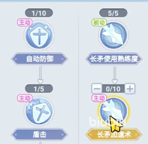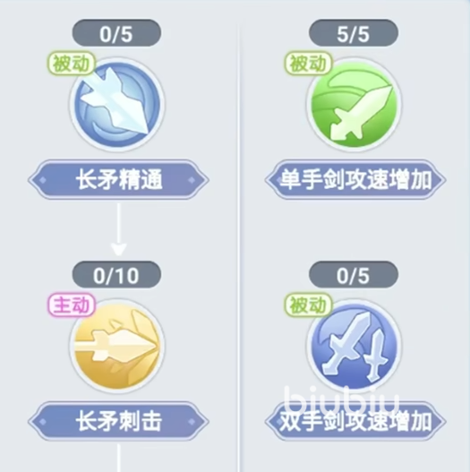 这个技能对于骑士来说是非常好用的。而且技能总共只有1级,是玩家的必点技能。接下来是长矛精通,这个技能可以让玩家们在使用长矛的时候获得攻击力,攻击速度,暴击的加成。除此以外骑士还有着单手,双手的攻速增加。玩家们根据所选择的武器来决定点什么被动。建议玩家们前中期可以点长矛精通,主要是剑类的武器好用的基本上都是在后期才会出现,前中期还是长矛的性价比更高一些。