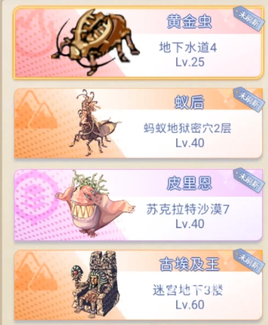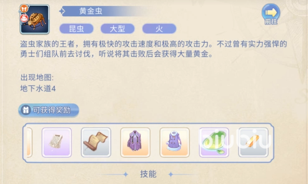 MVP的怪物有很多,接下来我们便为大家介绍几个询问较多的MVP敌人。黄金虫是玩家们初期所遇到的第一个MVP敌人,它基本上只会在下水道的4F出现。黄金虫的等级虽然只有25级。但是其本身的闪避是非常高的。玩家们在挑战的时候需要确定自身的准确率够不够,如果不够的话尽量叫上队员去挑战。黄金虫会使用金钱攻击,暴击,隐匿,召唤小弟,火箭术,治疗等技能。因为其属性为火,我们可以携带水灵装备或者使用水系的魔法较好。