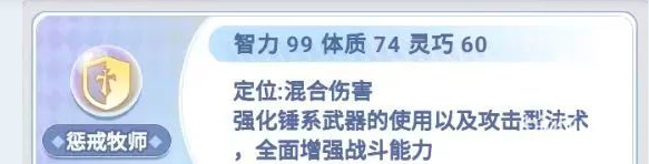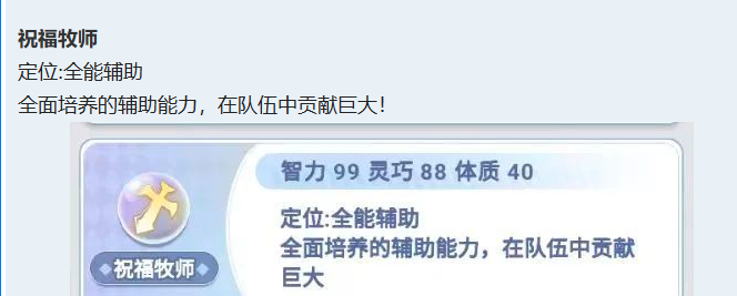 职业的属性加点主要体现在智力方面,因为他走的路线主要是以力量以及敏捷度为主,所以像是可以提高魔法攻击能力以及防御能力的智力,就是大家优选的发展方向,至于选择力量则是为了提高这个角色的物理攻击效果以及防御力,灵敏可以提高他躲避攻击的闪避能力以及输出的命中率,因为这个角色在游戏中并不主输出,所以闪避能力非常重要,确保自己的安全情况下才能给队友去叠加一些增益效果。