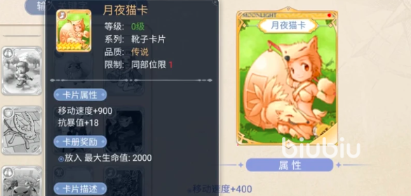 月夜猫卡虽然不是加攻速的,但是很适合以攻速为主的职业使用,它会提高大家的移动速度,并且还有一点额外的暴击数值加成,很利于那些伤害高的角色瞬间的移动进行进攻,或者是躲避敌人的攻击。