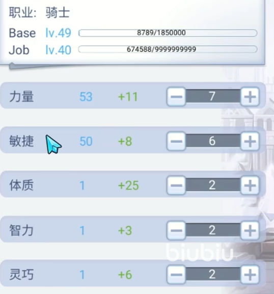首先我们先说属性上的加点,敏骑的主要加点方式和剑士时期是不一样的,我们首先主要属性是STR,然后副点AGI。这样才有了攻击力的同时,攻速也不会低很多。如果玩家们觉得自身的命中率有些低的话,也可以补一些DEX这个属性来修正一下准确度。