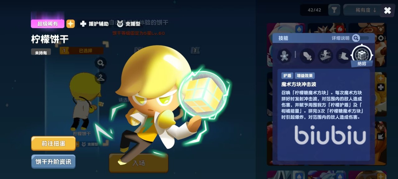 基本攻击柠檬电流,使用魔术方块发射镭射光进行攻击。特殊技能闪电袭击,按照顺序依次打击范围内的敌人。绝招魔术方块冲击波,召唤出柠檬糖魔术方块,每次将魔术方块拼好后,都能发射冲击波,对范围内的敌人造成伤害,同时给周围的我方赋予柠檬护盾和柑橘能量,在拼完三次魔术方块后会引起爆炸,对范围内的敌人造成伤害。这个角色主要的作用就是利用自身的被动或者是绝招,去给周围添加护盾以及能量等状态。因为自身可以带来光属性输出增加,所以最佳队友就是那些光属性的输出型饼干人。