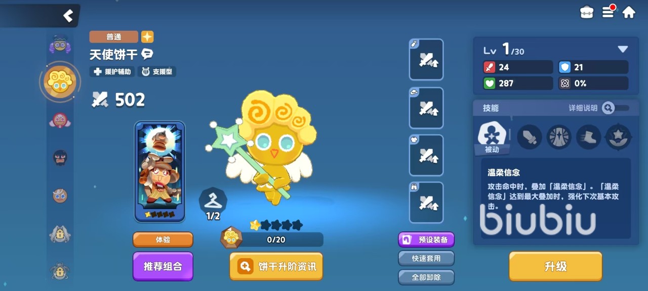 首先来了解一下天使饼干这个辅助角色的技能,它的被动温柔信念,在攻击命中时会叠加温柔信念,当叠加到最大层数时,下一次基本攻击获得强化效果,最多能叠加5层。基本攻击天使之星,发射出星星进行攻击,普通状态的攻击伤害为160%。在获得强化之后变为天使之光,发射出强化后的星星攻击目标,在命中时会产生增益糖果,给我方恢复生命值和增加攻击力。强化后的攻击伤害达到210%,可恢复4%最大生命值,10%的攻击力加成。