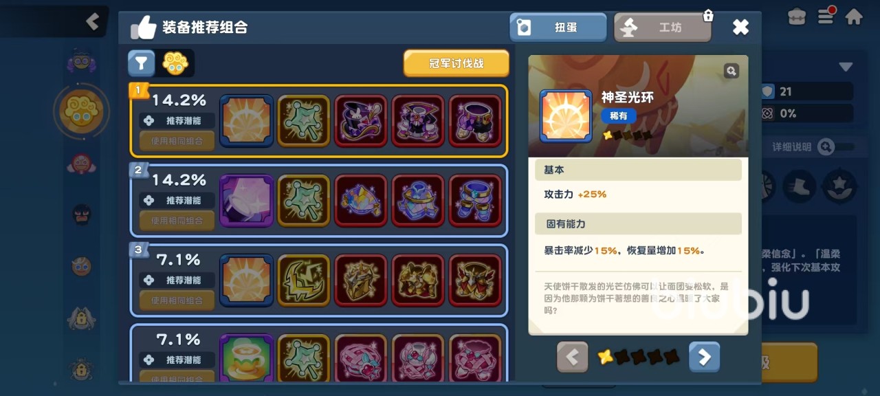 为了继续强化自身在治疗和辅助方面的优势,在搭配方面也要做好工作。在法宝卡方面,推荐选择神圣光环,能够增加攻击力,提减少暴击率,增加恢复量。这张卡非常适合天使饼干去选择,使得治疗量大幅度增加。武器选择星光绽放天使棒,增加攻击力,提升恢复量。其他装备可以选择永恒大魔术师帽、永恒大魔术师上衣和永恒大魔术师裙。这一套组合很适合辅助型饼干使用,套装的效果是,周围的饼干如果属性方面和装备此套装的饼干相同,那么就能增加其造成的属性伤害。