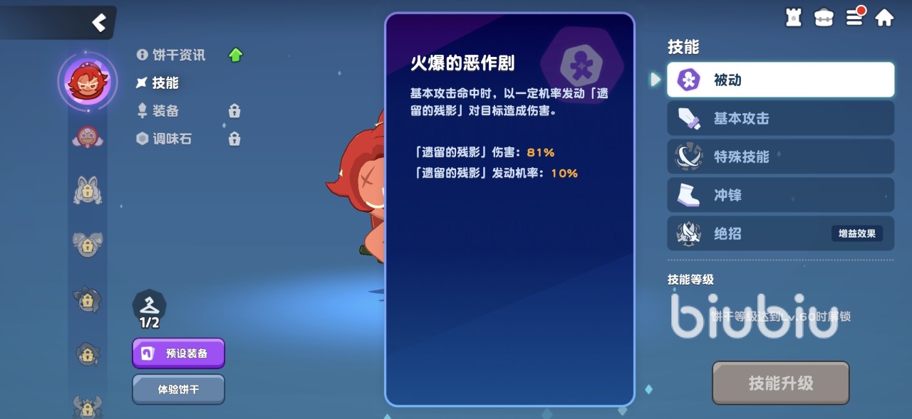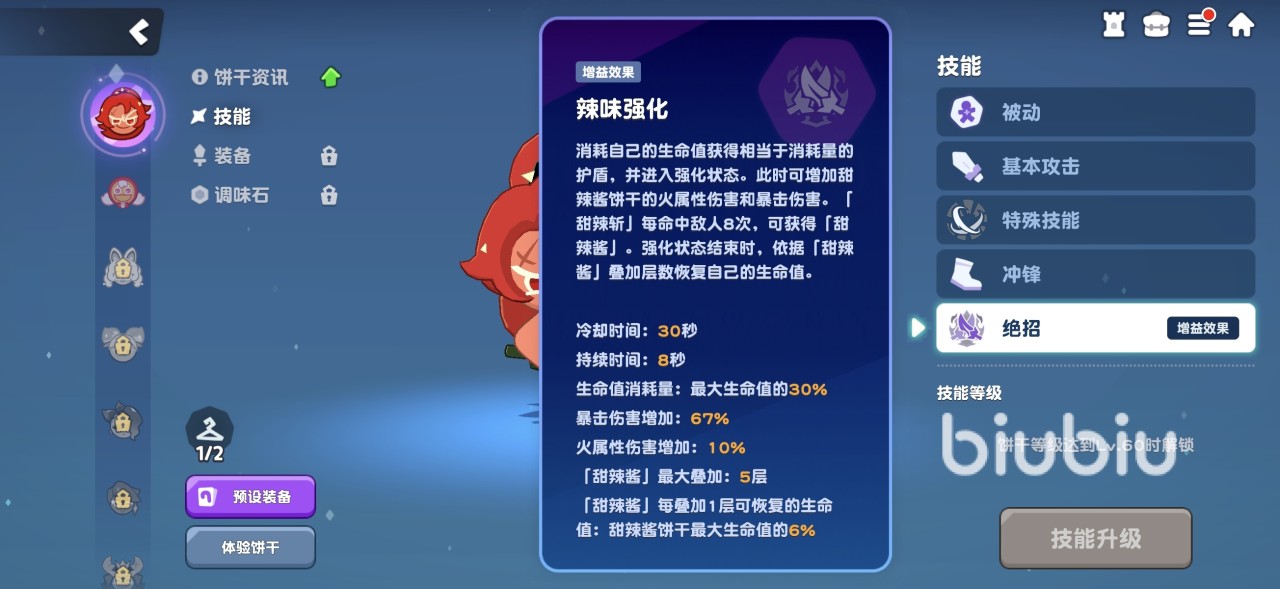 基本攻击是挥舞手中的辣椒,连续攻击最多四次,第四次伤害最高。特殊技能甜辣袭击,甜辣酱饼干消失后可快速攻击一定范围内的敌人,该技能冷却时间9秒钟。绝招辣味强化,通过消耗自身生命值,获得相当于消耗量的护盾,并进入强化状态。状态下甜辣椒饼干火属性伤害和暴击伤害都会提升,每命中敌人8次就可以获得一份甜辣酱,强化状态结束时,依据甜辣酱叠加层数来恢复自身生命。1层甜辣酱可以恢复6%的最大生命值,最多叠加5层。因为使用此技能消耗了最大生命值为30%,而暴击伤害和火属性伤害增幅巨大,所以这个技能的收益极为可观。