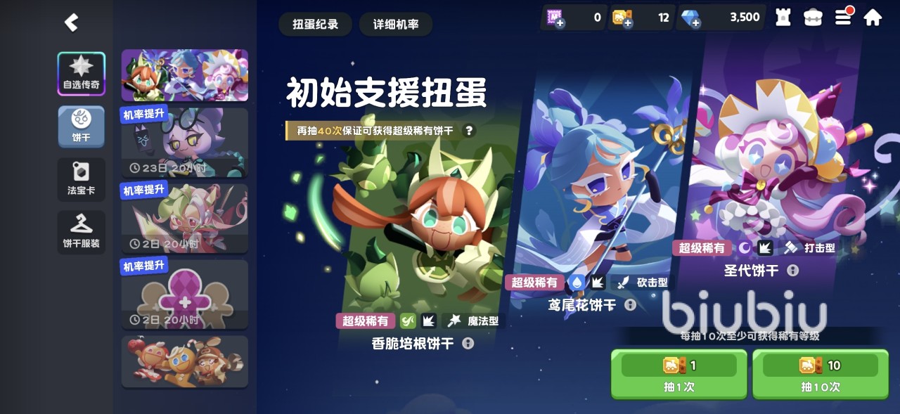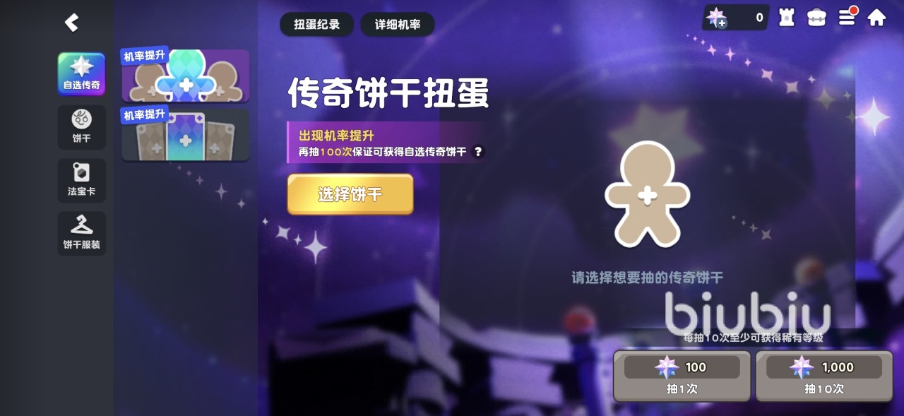首先是自选传奇卡池,其中包括传奇饼干和传奇法宝卡这两类。这里的优势是可以自己选择出要抽的传奇饼干和要抽的传奇法宝卡,这样会提高选定的几率。这两个池子都是保底100抽,也就是只要抽够100次,保证可以获得自选的传奇饼干或者是自选的传奇法宝。如果大家想要养成阵容中的核心,那么这个池子非常重要,可以快速找到最适合自己阵容使用的主力角色,包括饼干人和法宝,这样实现更好的搭配。第二个是在饼干人池子中,除了有一个初始支援池之外,其他都是对应角色池子。在初始池中40次可以保证出现一个超级稀有饼干。在其他池子中,指定角色出货几率会更高,每个池子都是100抽打底。