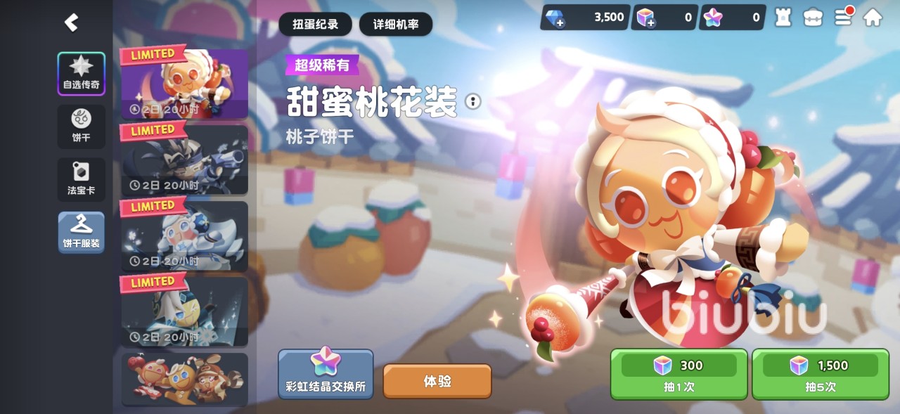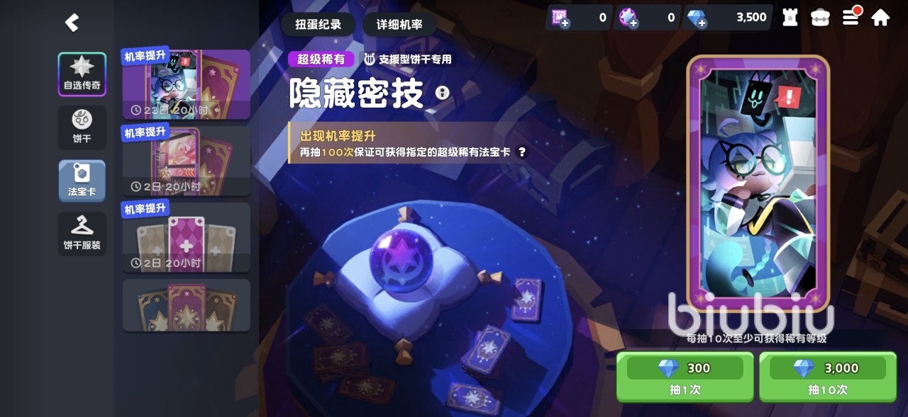 法宝池也是如此。每个法宝池都是100抽打底,除了有一个基本法宝池之外,其他池子也都是有对应的法宝卡,会根据时间不断循环,如果中间出现自己需要的可以直接去抽,几率会更高一些。最后是饼干服装卡池,这里抽到的都是各个饼干人角色的时装,时装对战力影响不大,所以对大多数玩家来说,这个池子可以先放一下。