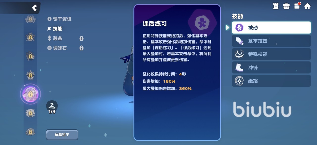 奶油苏打饼干的被动效果是在使用特殊技能或者是绝招后可强化基本攻击,强化后提高伤害,命中后可叠加状态。该状态叠加到最大层数时,使用基本攻击可以消耗所有叠加层数,并造成更多伤害。这就相当于给奶油苏打饼干定好了简单的战斗循环,就是使用特殊技能之后打出强化基本攻击,使用绝招后也是打出强化后基本攻击。强化持续效果为4秒钟,一定要抓好这4秒输出时间。特殊技能是最多连续攻击三次,绝招是朝前方强力挥剑,造成一次高额伤害。技能效果都比较简单,用于近战非常实用。