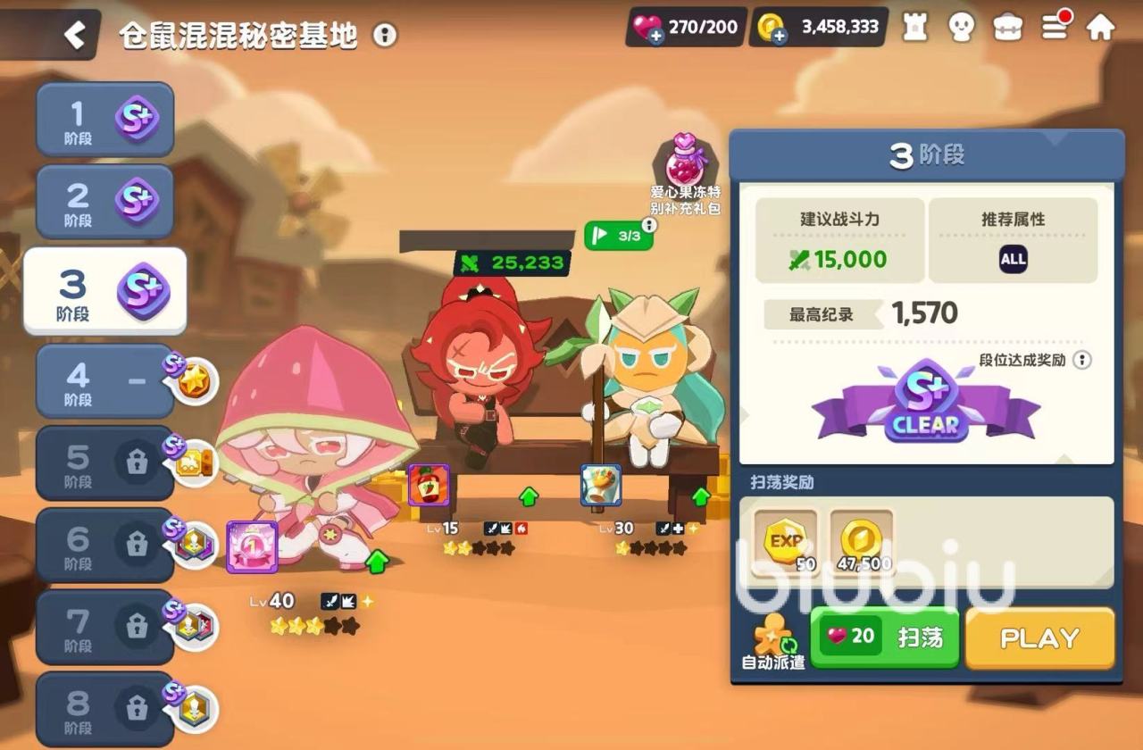 接着说第二个经验之塔:仓鼠混混秘密基地,和六角蜂森林一样,它也有着战斗力的要求,随着爬塔进度越来越高,也会出现推荐的饼干人属性。在这里大家能获得的挑战奖励是金币和经验,一阶段获得的经验是30点,金币为22000,8阶段获得的经验是160点,金币为135000。这个关卡中玩家们需要在规定时间内打败尽可能多的小怪,关卡会根据击败数量来给大家评分,最高为S+,能够拿到顶格奖励。