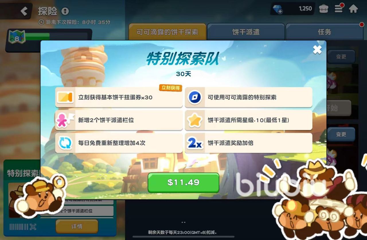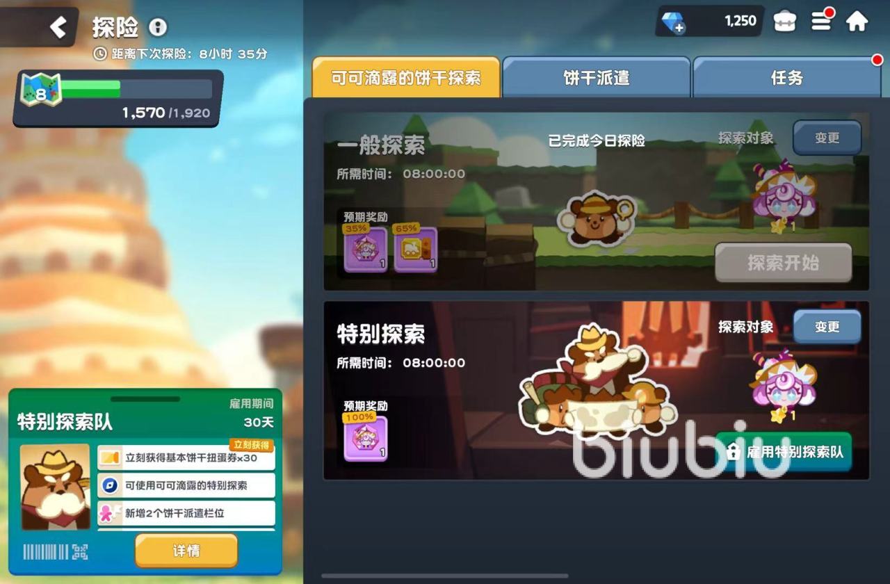 除了前文中提到的重复抽取会自动转化为随便外,大家也有可能直接从卡池中抽到饼干人的碎片,数量为1,虽然这样单次累积的数量较少,但可以很轻松地将一些常驻卡池角色超越至满星。第二种获得碎片的办法是探险玩法中的【可可滴露的饼干探索】,通过这一内容大家可以搜集到稀有饼干的灵魂石,也就是碎片,每天免费的探索次数是一次,使用谁去探索就能获得对应得的灵魂石,探索成功概率为35%。氪金的朋友有也可以选择去雇用特别探索队,有100%的几率获得对应碎片一枚。