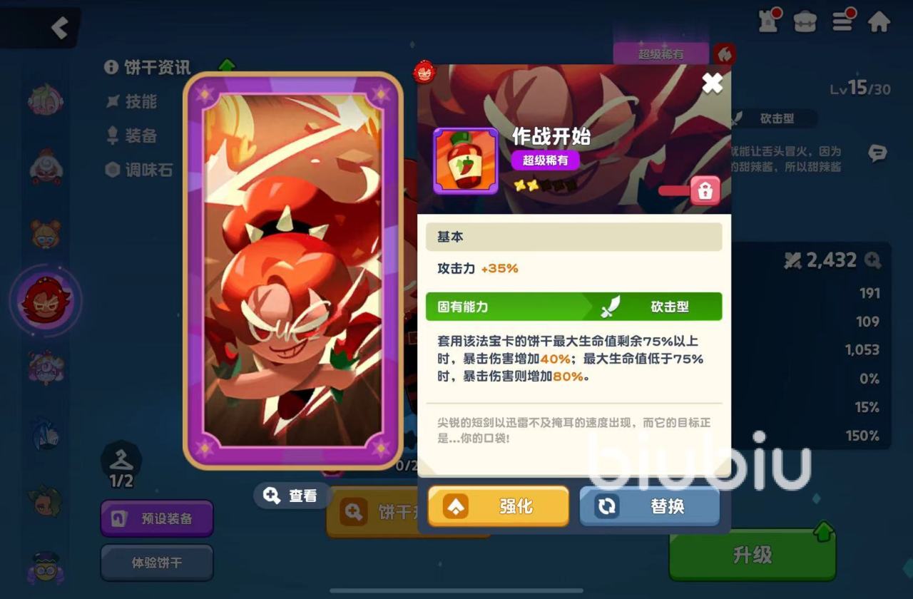 为了防止朋友们找不到饼干人联盟的正版下载地址,推荐大家可以去手游福利最多的九游下载,里面还有1元就能入手的白银会员,可以通过它每个月领取50元的游戏券,这样氪金更加划算,整年累计下来就有600的券可以用。还可以通过九游来领取海量游戏礼包,另外有会及时更新的节假日以及活动礼包,能减少很多游戏中物资消耗的压力。接着说回到角色,第一个推荐的角色是只要按照新手教程就能领取到的甜辣酱饼干。作为同学们在游戏中首只获得的超级稀有品质饼干,甜辣酱饼干是帮助大家度过新手期的最佳输出选择。它战斗类型为砍击,通过领取新手奖励中发放的碎片,我们可以将她升至满级阶,火属性伤害的增益会直接提升到200%,同时她使用的的法宝卡【作战开始】也是能免费获取到满强化的。