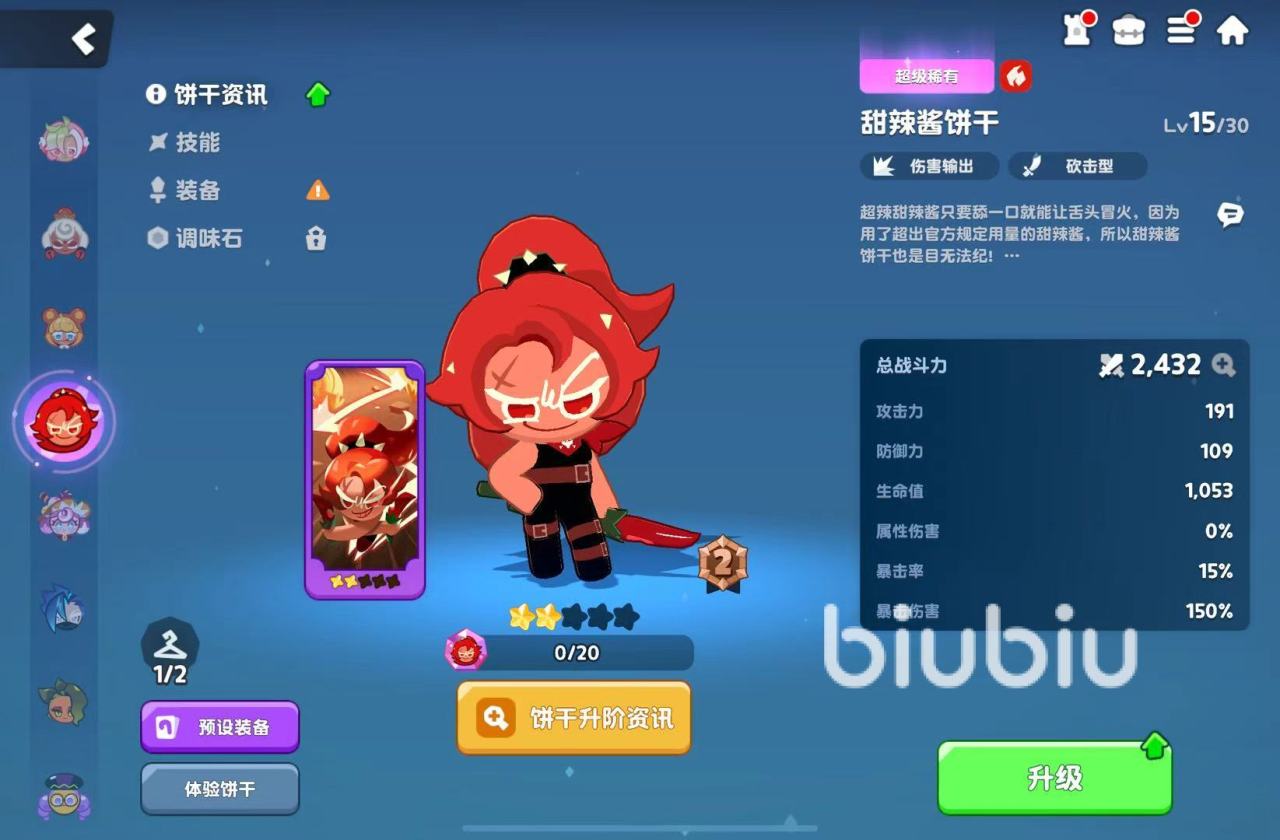 从面板来看,甜辣酱饼干在前期一众角色中绝对有着很突出的输出能力,技能甜辣袭击是aoe技能,在探索关卡中清理小怪非常有效率。绝招效果是强化自身,燃烧生命值获得护盾的同时可以增加爆伤与属性伤害,根据攻击敌人的次数赋予印记,绝招结束后会按照印记层数来恢复生命数值,绝招结合可以使用两次的冲锋,让甜辣酱饼干有了更强的机动性。培养到满配的甜辣酱饼干即使是在游戏后期,也能继续在很多场景中就业。