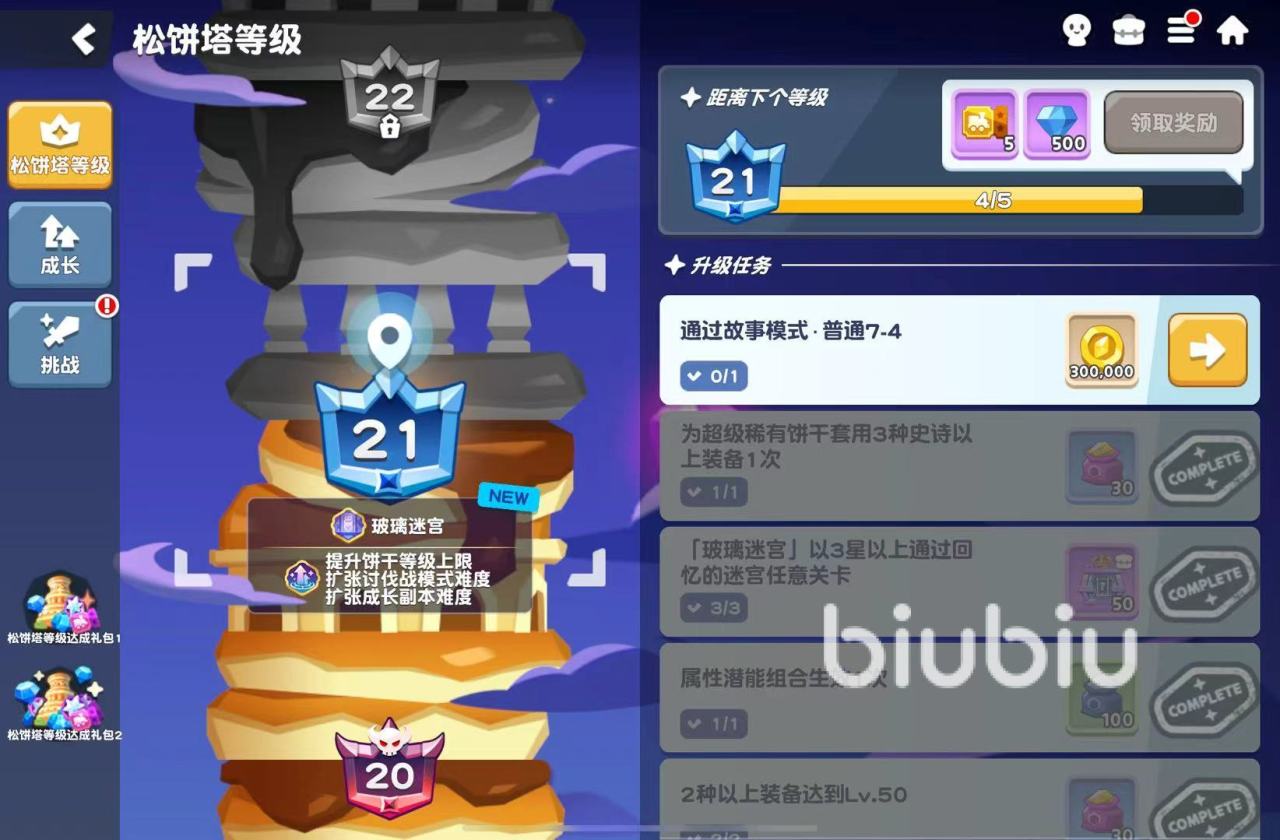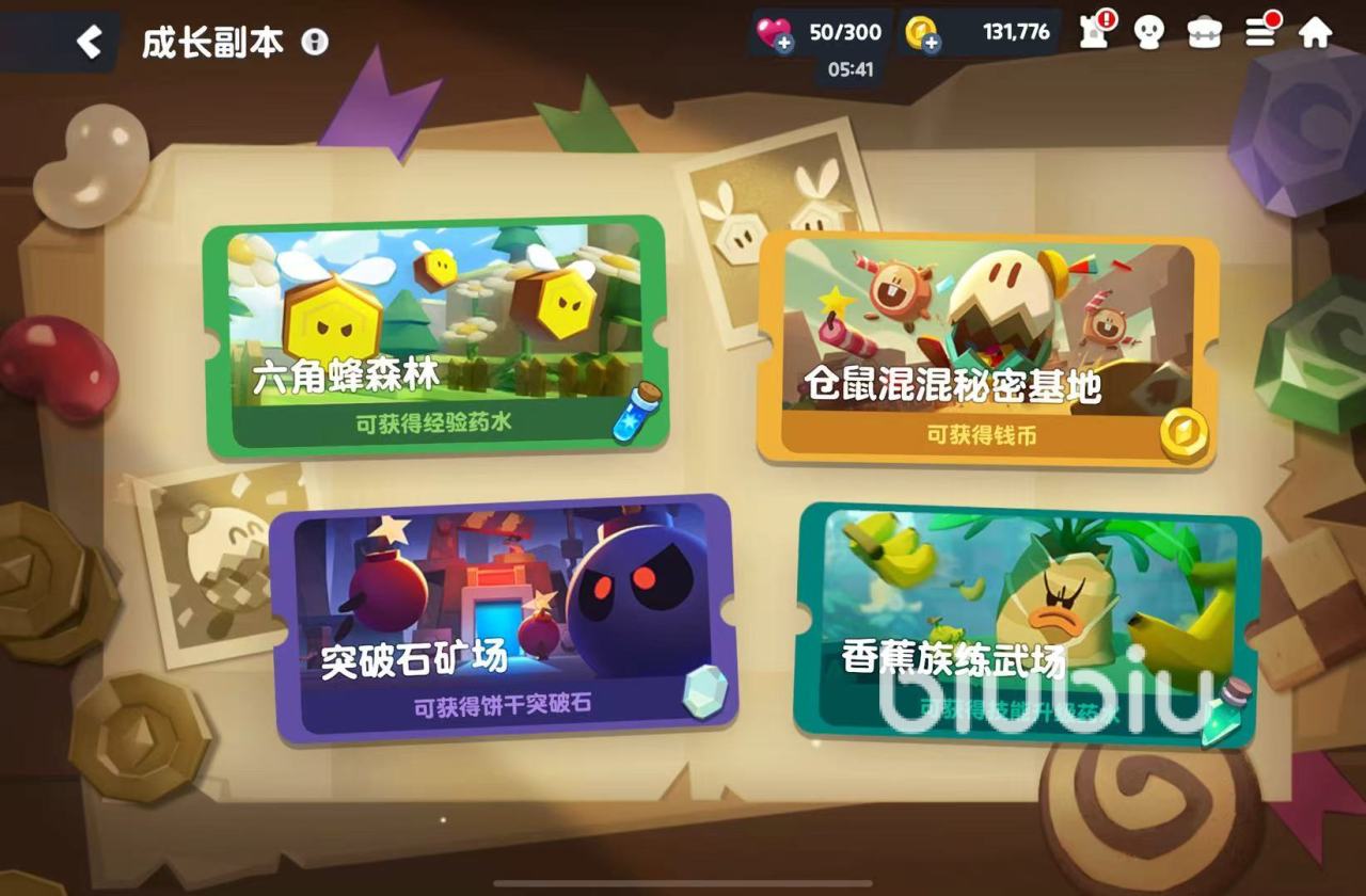 然后说说角色培养材料副本,这是小伙伴们获得培养资源的场所,在第一次通关后可以通过消耗爱心果冻刷取。成长培养副本一共有六角蜂森林、仓鼠混混秘密基地、突破石矿场以及香蕉族练武场四种,它们分别能提供经验药水、钱币、饼干突破石、技能升级药水,每个副本都有不同阶段,奖励随阶段数增加。需要完成前置关卡才能继续挑战,前期朋友们能从新手福利中获得大量资源,新手开荒阶段我们可以先打完这些副本的第一阶段,然后按需刷取。另外还有一个小技巧,就是大家其实可以把游戏中松饼塔升级所需要完成的任务当作后续的开荒指南,逐步去了解其中的各个模式和玩法。