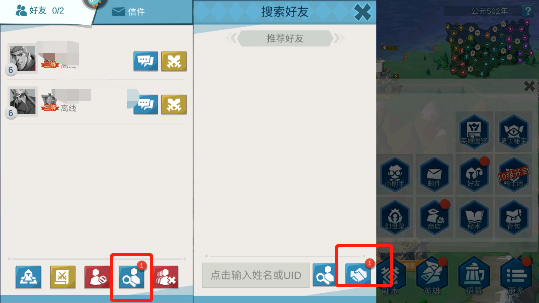 1、目前这款游戏是无法随机添加好友的,对于一款非常需要好友的游戏来说却是比较烦人。按照上述的步骤点击展开“放大镜”,在这里点击输入其他玩家姓名或者是UID来添加好友。
