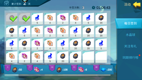 2、分别在连续签到三天、七天、十四天、二十一天、三十天可以获得额外奖励。