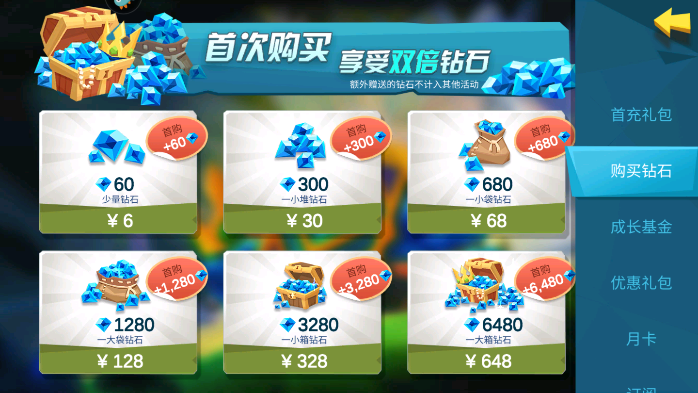1、获取钻石最直接的方式就是充值了,和大多数的游戏一样,首次充值的话会有额外钻石赠送。