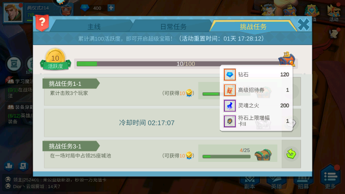 1、挑战任务具有阶段性,完成当前任务后会刷新下一个任务阶段越靠后,奖励越丰厚。
