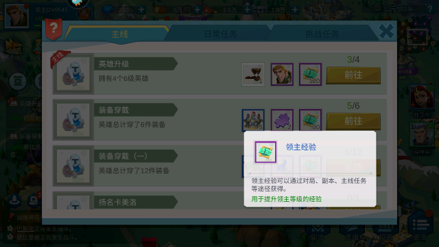 1、主线任务:完成主线任务可以获得大量的领主经验和其它道具奖励。每到达一定的领主等级,可以开放新的主线任务。