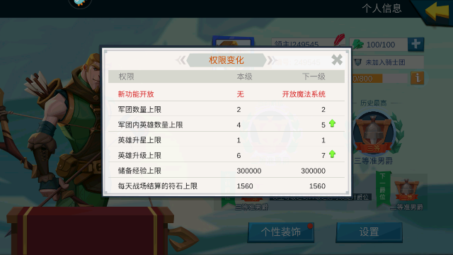 骑士团的等级关乎到整个游戏的进程,随着等级的提游戏玩法、强度、功能都能解放,比如新功能开放、军团数量上限、军团内英雄数量上限、英雄升星上限、英雄升级上限、储备经验上限、每天战场结算的符石上限。