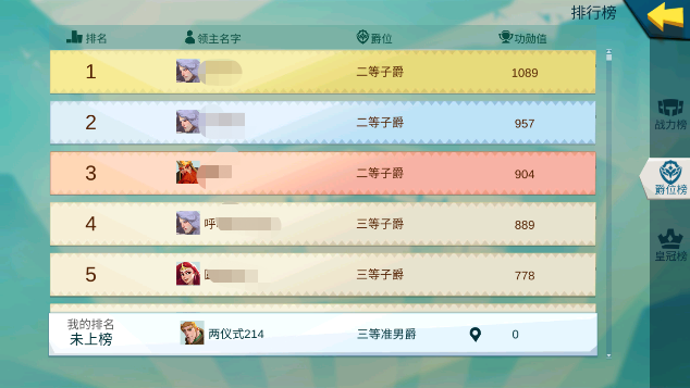 (2)爵位排行:点击游戏主页面左晓娇位置的“树状图”,这个是游戏的排行功能,点击“爵位榜”即可查看当前服务器的段位排行,以及自己的排行情况。