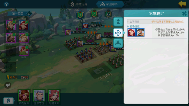 3、上阵羁绊是非常重要的一点,这个是有上阵时候的英雄来决定的,部分英雄在一起可以触发羁绊效果,不同的英雄触发条件是不同的。
