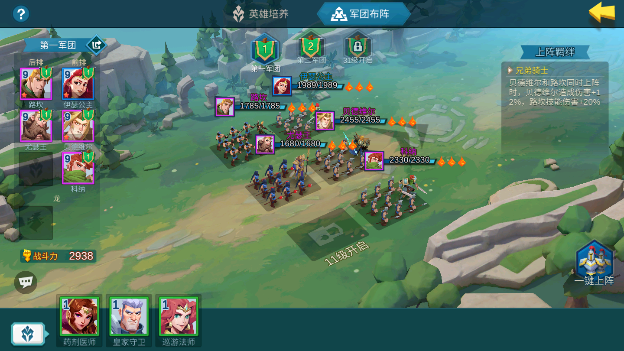 1、首先进入到游戏中的主页面位置,点击并打开最下方的“英雄”功能,在英雄功能的上边点击“军团布阵”,在这里就可以自由搭配自己的部队了。